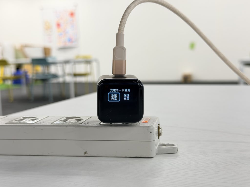 これは単なるオマケではありません。ノートパソコンやタブレットを電源につないだまま作業する場面では、速さよりも発熱やバッテリーへの配慮が気になることがあります。そうしたときに、保護充電モードを選べるのは、かなり実用的です。